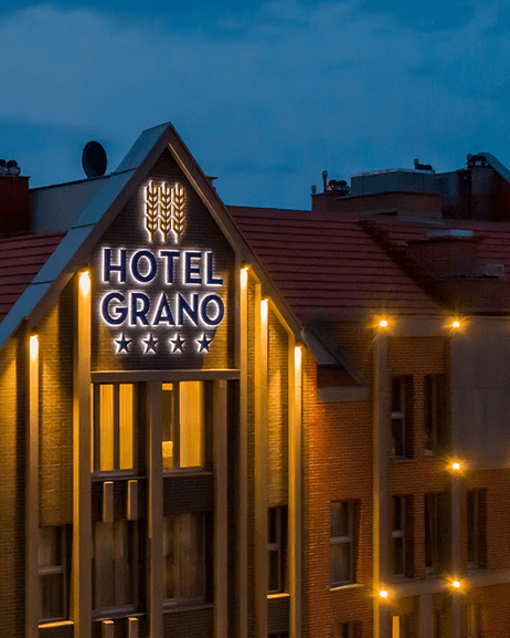 Hotel Grano ist ein modernes Komplex, das in einen Hotel- und einen Apartmentbereich unterteilt ist. Unsere Aufgabe bestand darin, ein gut lesbares und ästhetisches Leitsystem zu entwickeln, das den Gästen die Orientierung erleichtert. Wir haben optisch einheitliche, beleuchtete Logos entworfen, die die Namen Grano Residence und Hotel Grano vereinen. Zusätzlich haben wir die Innenräume beschildert und auf jedes Detail geachtet. Das Ergebnis? Stilvolle, elegante und funktionale Beschilderung, die perfekt zum Charakter der Investition passt.