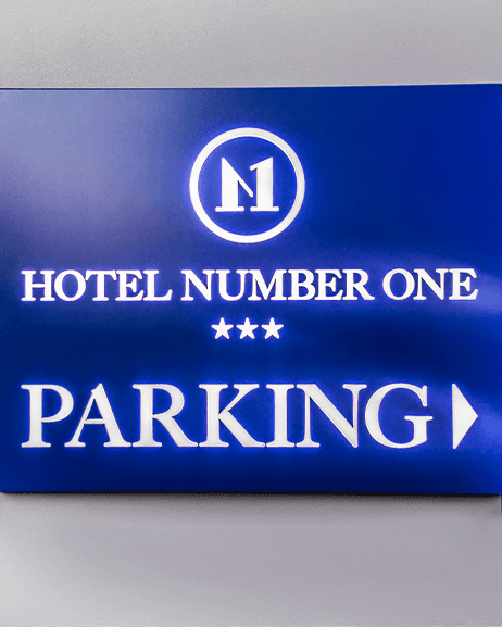 Eine gut sichtbare und klare Parkplatzbeschilderung erleichtert den Hotelgästen die Orientierung. Die kontrastreichen Farben und die intensive Beleuchtung sorgen dafür, dass das Logo unter allen Lichtverhältnissen hervorsticht.