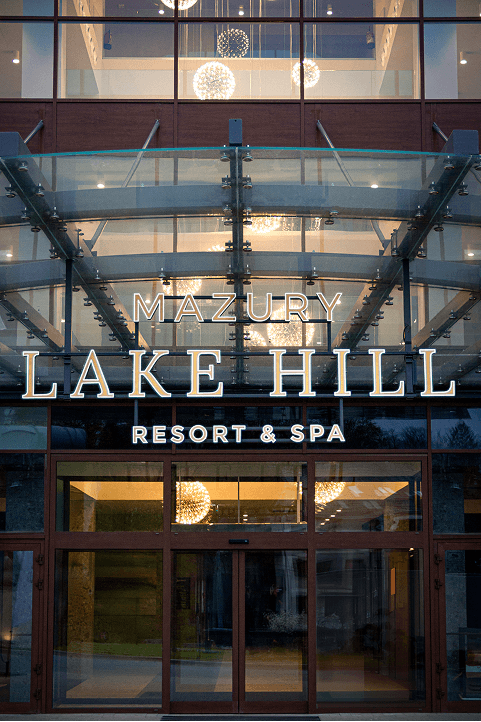 The illuminated Mazury Lake Hill Resort & Spa logo above the main entrance emphasizes the hotel’s modern and elegant character. Its excellent visibility both during the day and at night creates an unforgettable first impression.