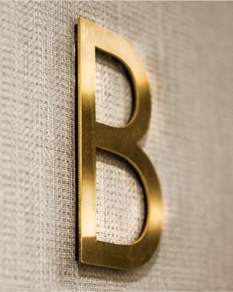 Letras doradas y pictogramas cortados con precisión en metal, que aportan un carácter elegante y lujoso al interior del hotel. El diseño minimalista se integra perfectamente con la decoración prestigiosa del establecimiento.