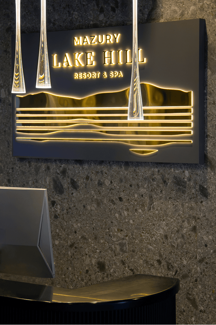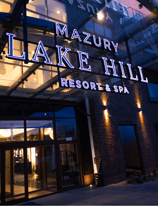 Podświetlane logo Mazury Lake Hill Resort & Spa nad głównym wejściem podkreśla nowoczesny i elegancki charakter hotelu. Doskonała widoczność zarówno w dzień, jak i w nocy tworzy niezapomniane pierwsze wrażenie.