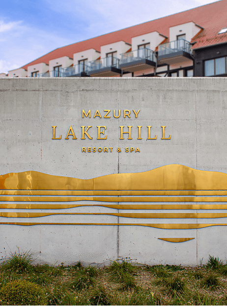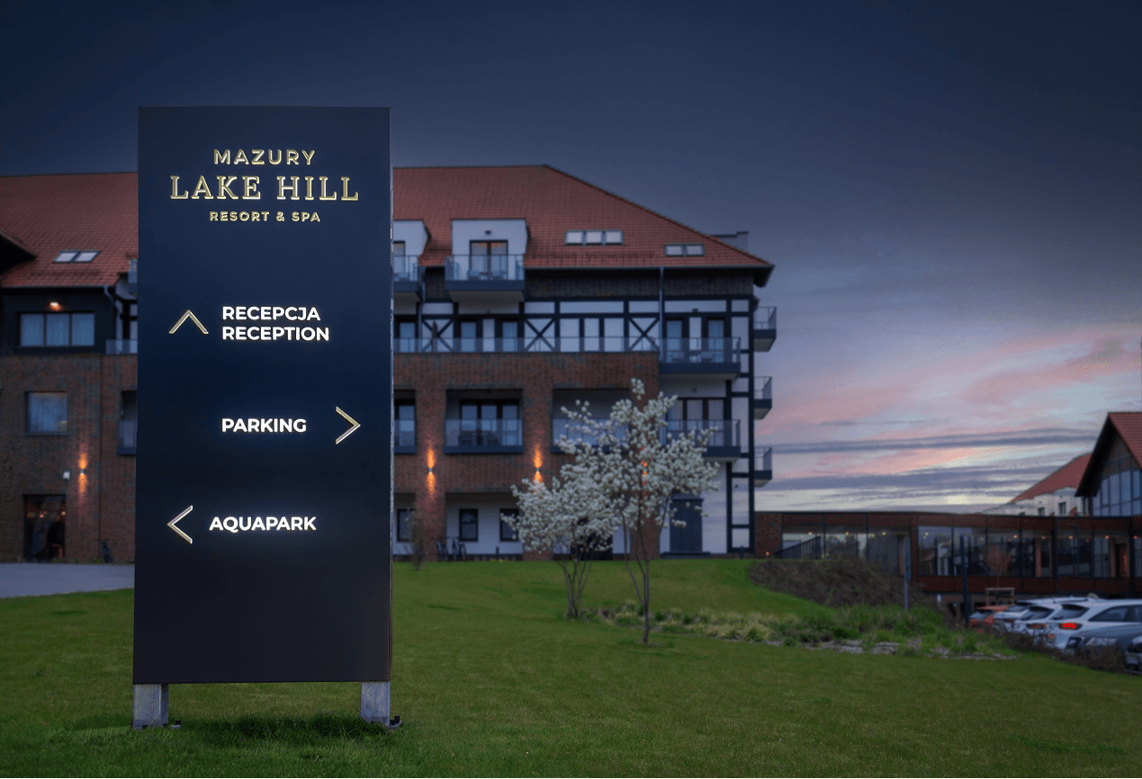 Przestrzenne logo Mazury Lake Hill Resort & Spa, wykonane z akrylu i pokryte złotą szczotkowaną blachą, to elegancki element wizualny, który podkreśla prestiż hotelu. Uzupełnieniem jest nowoczesny pylon wjazdowy z czytelnym oznakowaniem kierunkowym, prowadzącym gości do recepcji, parkingu i aquaparku. Oba elementy doskonale harmonizują z otoczeniem i stanowią wyrazisty punkt orientacyjny dla gości wjeżdżających na teren obiektu.
