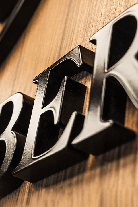 Nowoczesne, czarne litery na tle drewnianej ściany podkreślają prestiżowy charakter hotelu. Satynowe wykończenie i przestrzenna forma sprawiają, że logo jest nie tylko eleganckie, ale także doskonale widoczne z daleka.